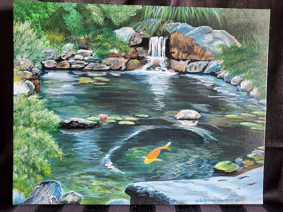 Koi Pond Waterfall Koi Fish Painting Original Art Acrylic Etsy